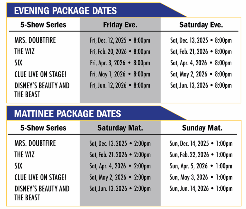 *Dates and show titles subject to change. Some package fees are non-refundable.