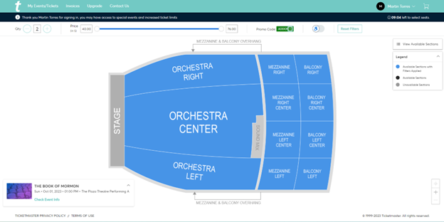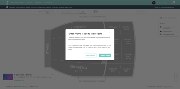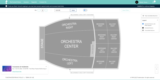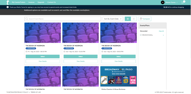 1. Click on Sign In tab in the top right and login with existing Ticketmaster login, or create a new login. You should use the e-mail address on file with Broadway in El Paso. Scroll down and click on BUY TICKETS.