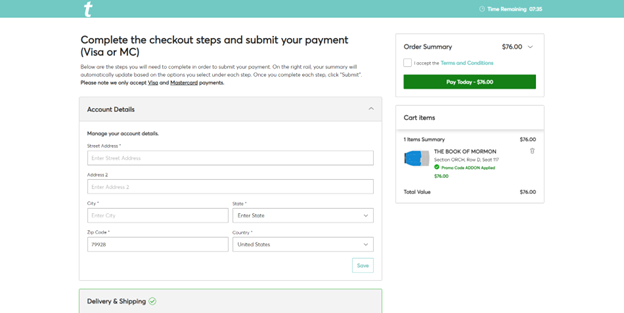 4. Enter ADDON in the promo code box located above the map in between the quantity and accessibility buttons and click APPLY
