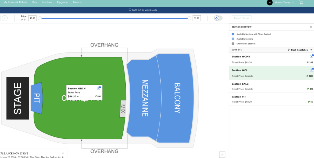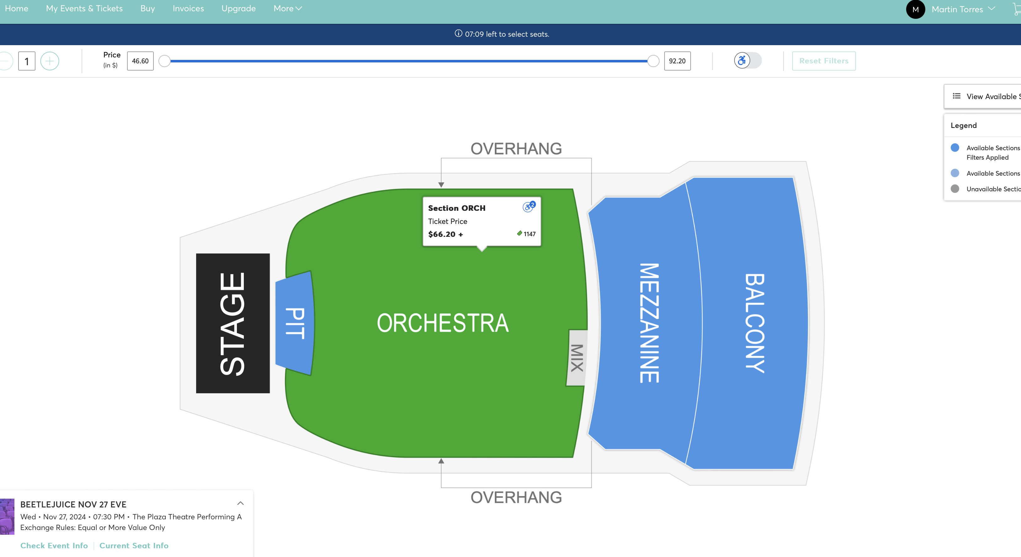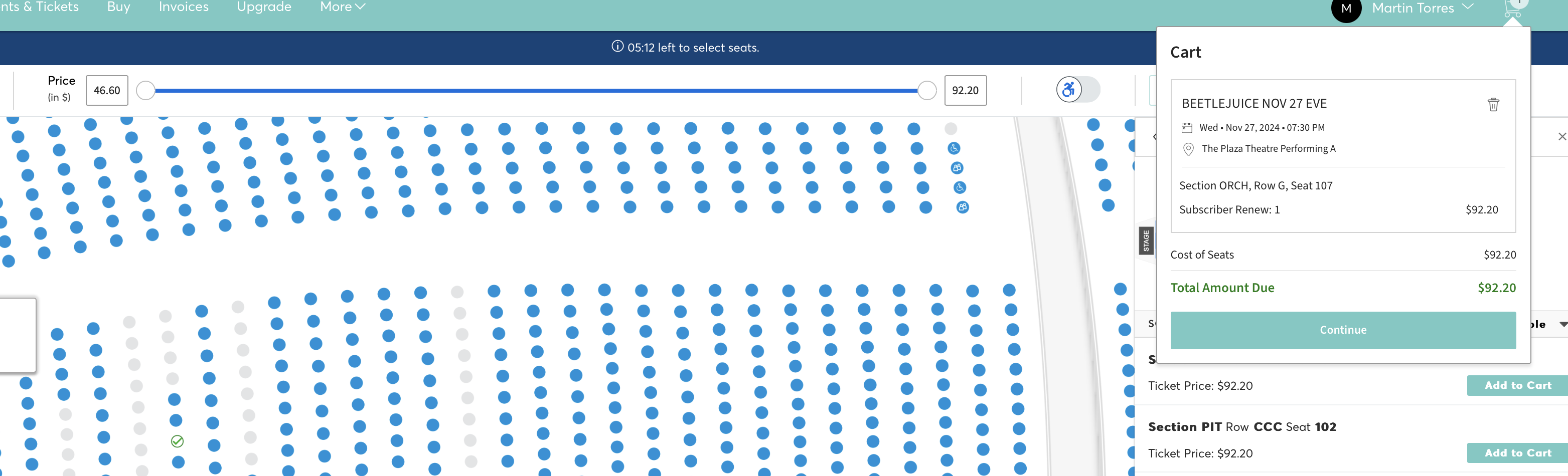 7. Click on map, scroll in, allow available seats to load, select new desired seats, click on cart in the upper right corner and click CONTINUE.